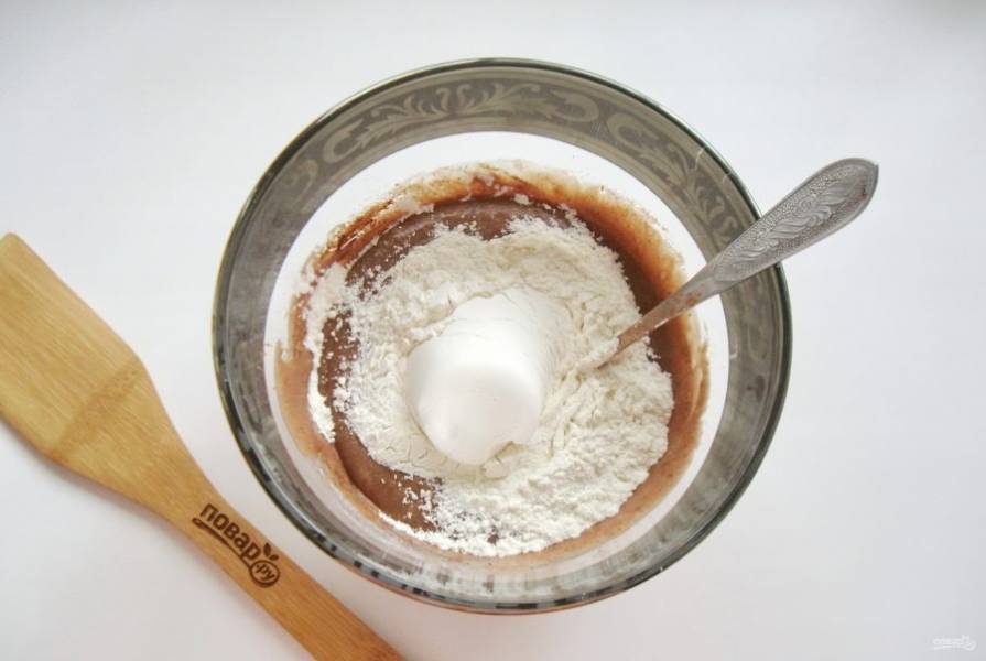 Добавьте соду, погашенную лимонным соком или уксусом. И пшеничную муку.