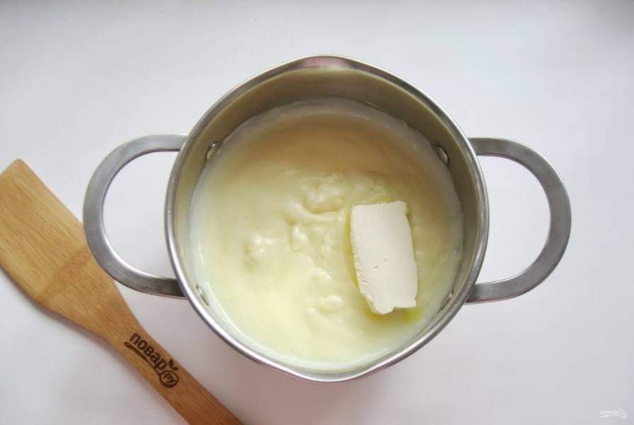 В горячий крем выложите сливочное масло.