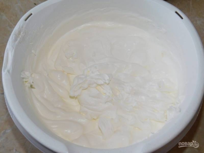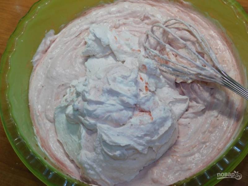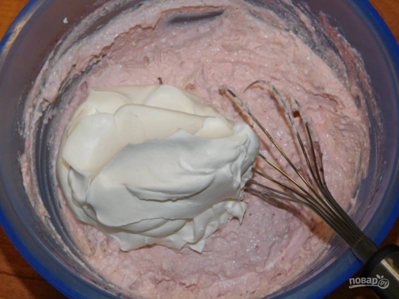 В творог добавьте немного жидкой клубничной массы, перемешайте венчиком. Затем добавьте немного сливок и тоже аккуратно перемешайте венчиком.