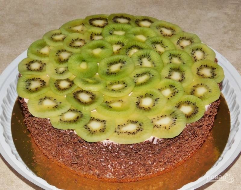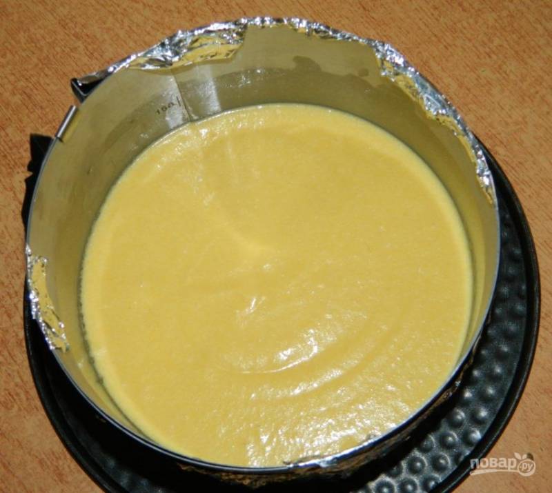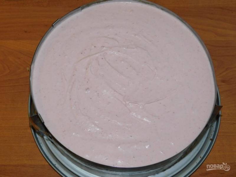 Выложите массу в форму на бисквитную основу и уберите в холодильник на несколько часов, чтобы торт хорошо застыл.