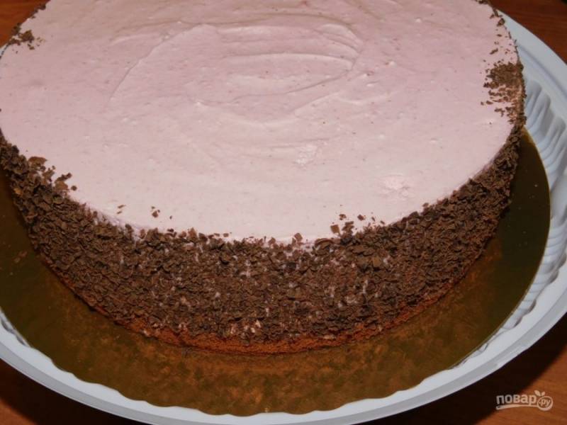 Застывший торт извлеките из формы, бока обсыпьте тертым шоколадом.