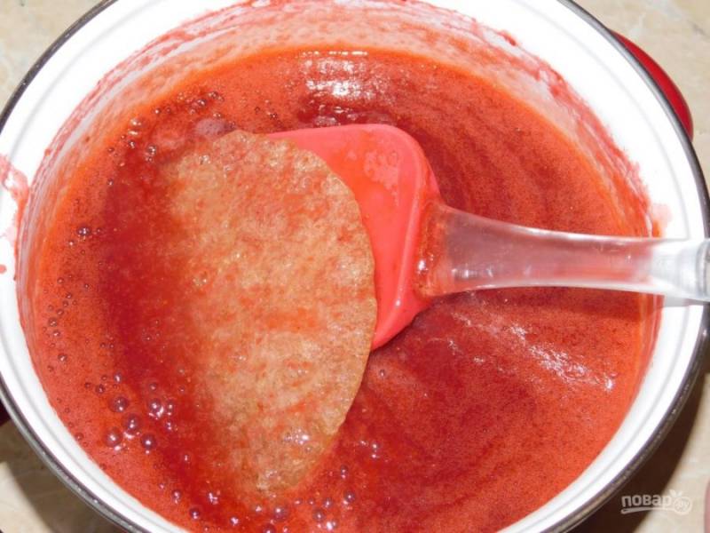 Клубнику измельчите в пюре и перелейте в кастрюлю. Добавьте 200 г сахара и доведите до кипения. В горячую клубничную массу выложите набухший желатин и размешайте до полного его растворения. Массу остудите.