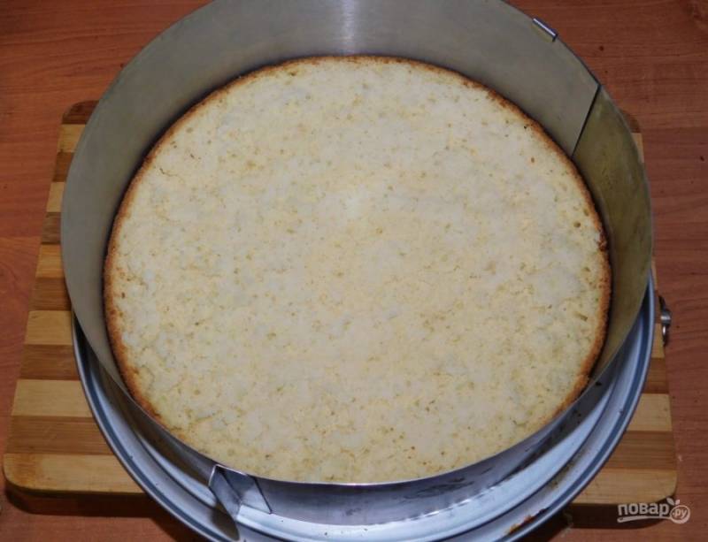 Готовый бисквит остудите и немного срежьте верх. Уложите его в разъемную форму.