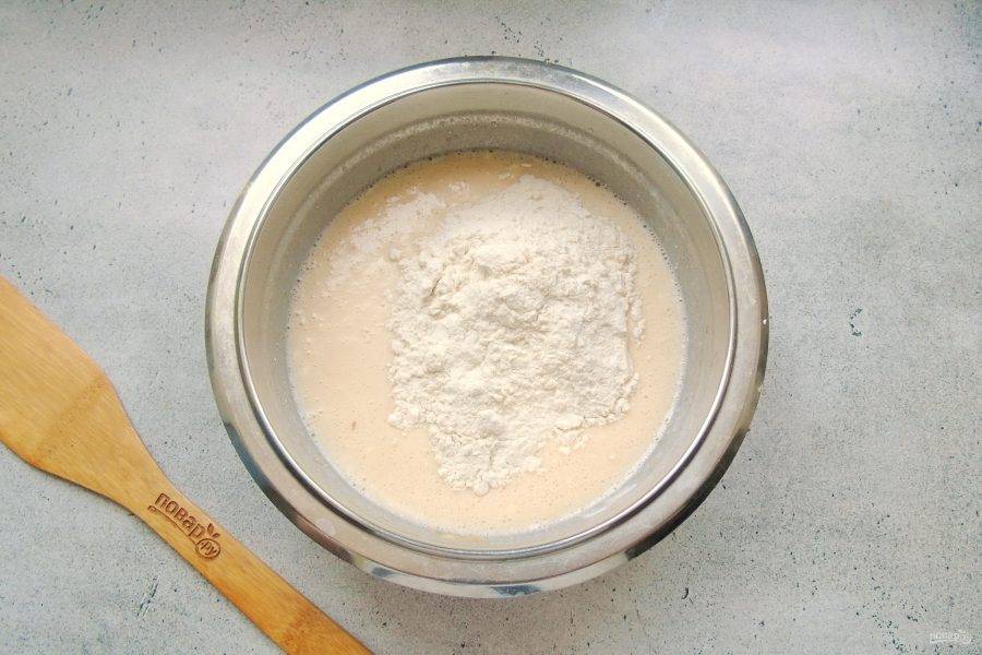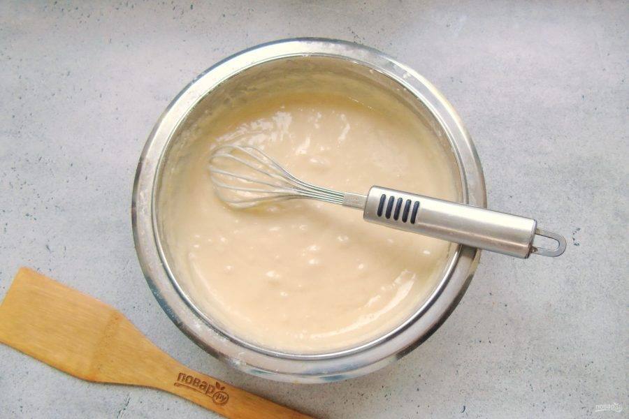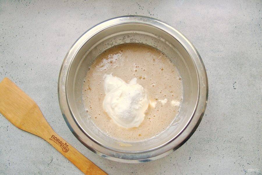 Немного взбейте яйца с сахаром и добавьте сметану. Перемешайте эти ингредиенты.