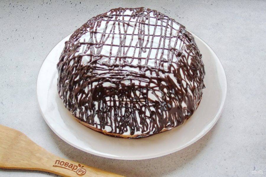 Миску с тортом накройте блюдом и переверните на него торт. С помощью кулинарного мешка полейте торт шоколадной глазурью.