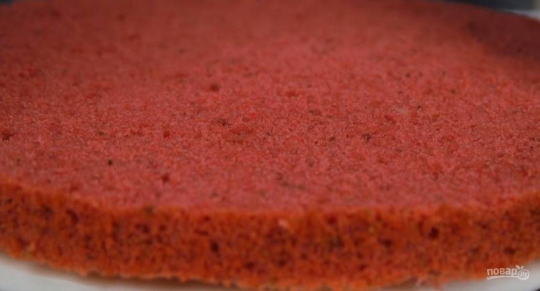 6. Оставьте корж в форме на 15 минут, после чего полностью остудите на решетке. Аналогичным образом испеките шоколадный корж, заменив часть муки на какао-порошок. У остывших коржей подравняйте верхушки. Для клубничной начинки желатин залейте холодной водой и оставьте для набухания.