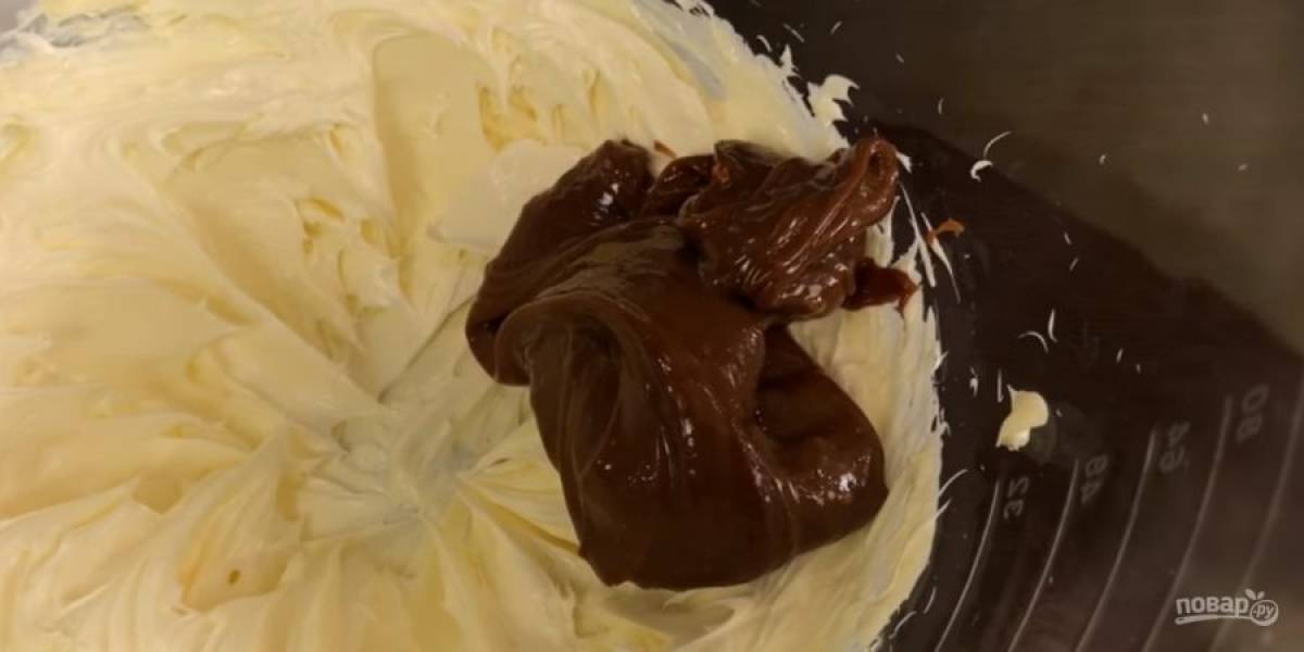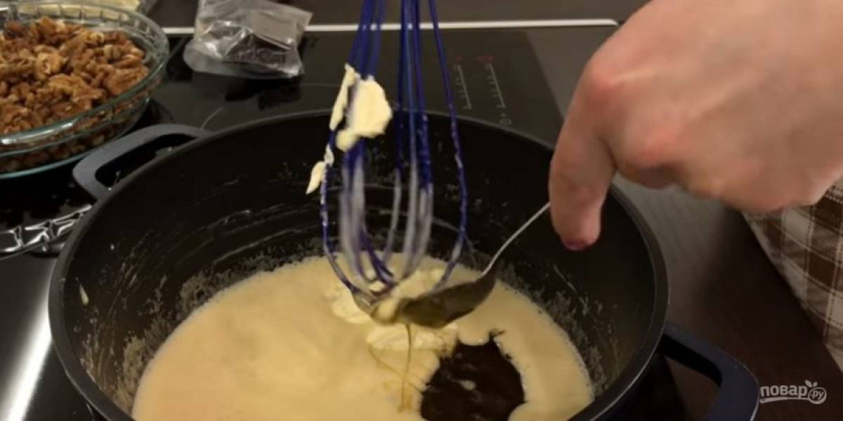 3. Дайте тесту постоять в течение 15 минут, чтобы оно хорошо остыло. Масло для крема взбейте миксером до белого цвета и добавьте вареную сгущенку. Снова хорошо перемешайте миксером.