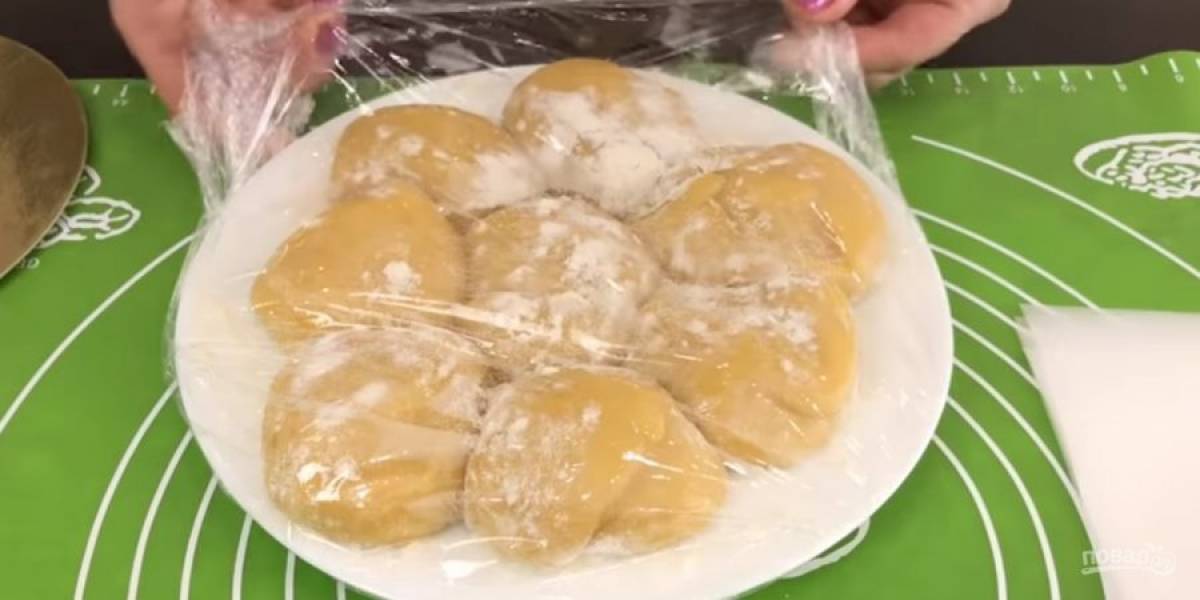 5. Тарелку припылите мукой, сложите на нее шарики теста, сверху также припылите тесто мукой. Накройте пищевой пленкой и отправьте в холодильник на 30-40 минут. На пергаментной бумаге раскатайте коржи и вырежьте их по диаметру формы/подложки.