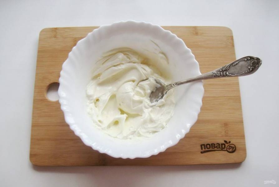 Пока корж для торта остывает, приготовьте крем. Жирную сметану смешайте с сахарной пудрой и ванильным сахаром. Я не люблю очень сладкие торты, мне хватило 3-4 столовых ложки сахарной пудры. Вы ориентируйтесь на свой вкус.