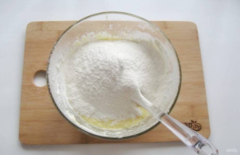 Постепенно всыпьте просеянную муку и очень аккуратно перемешайте тесто лопаткой.