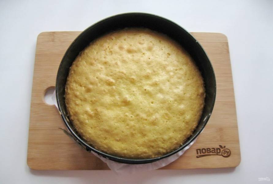 Выпекайте корж в духовке, заранее разогретой до 175 градусов 35-40 минут. Готовность проверьте сухой палочкой.