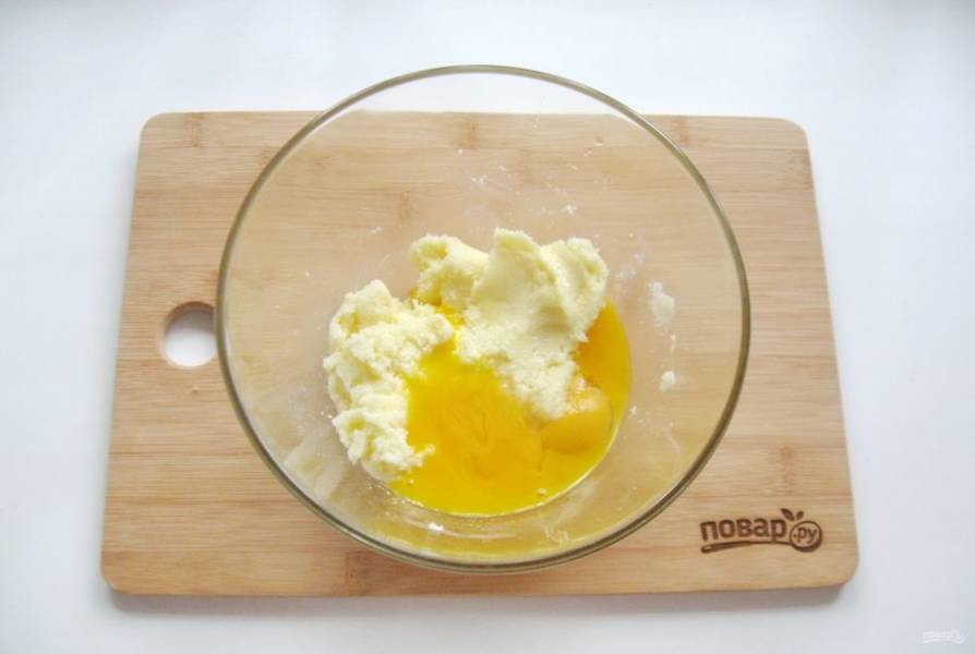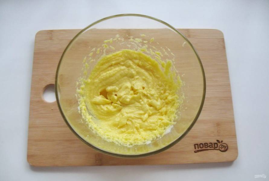 Взбейте миксером сахар с маслом. Отделите желтки от белков и добавьте в миску.