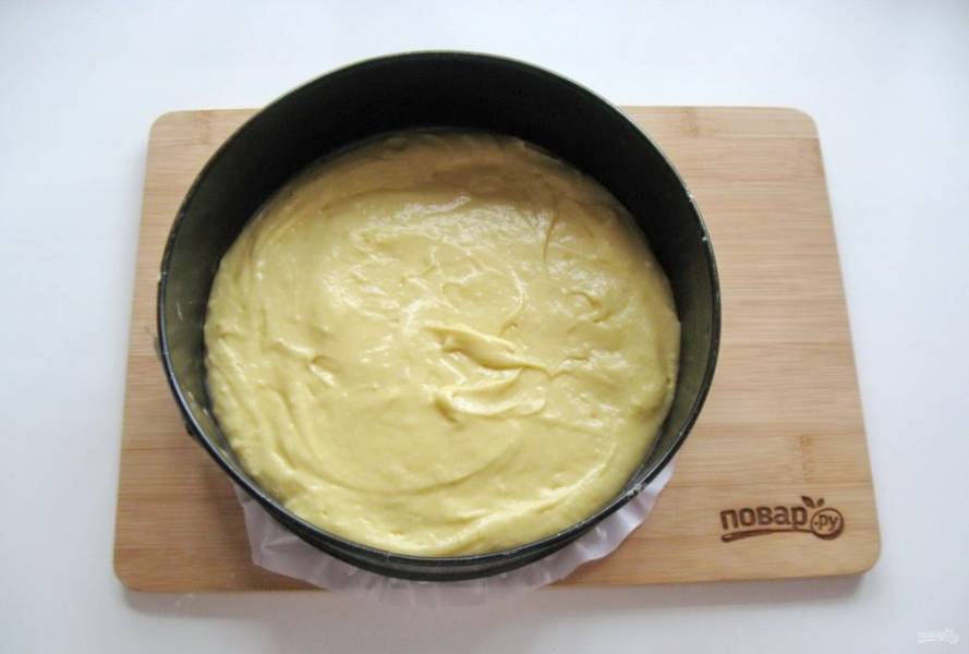 Приготовленное тесто выложите в форму, смазанную маслом или застелите пекарскую бумагу на дно формы.