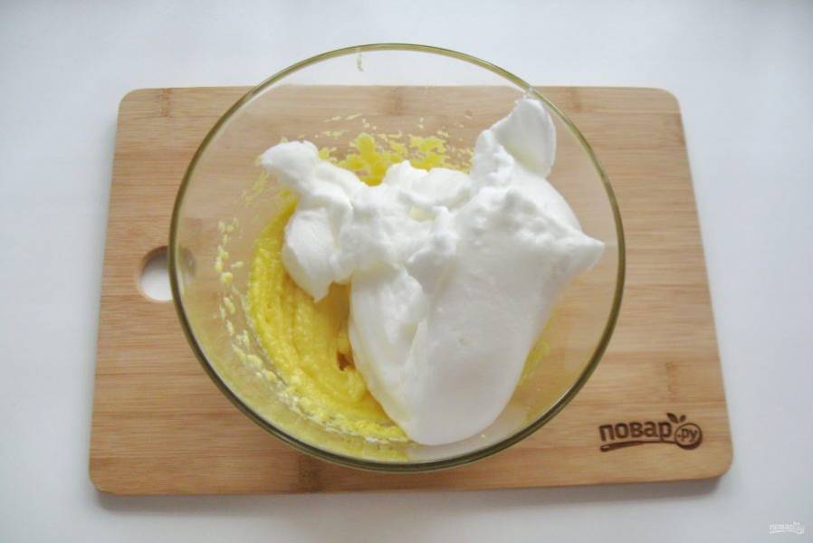 Белки взбейте в пышную, устойчивую пену и выложите в тесто. Перемешайте с остальными ингредиентами.