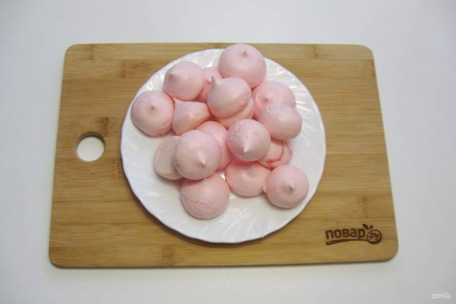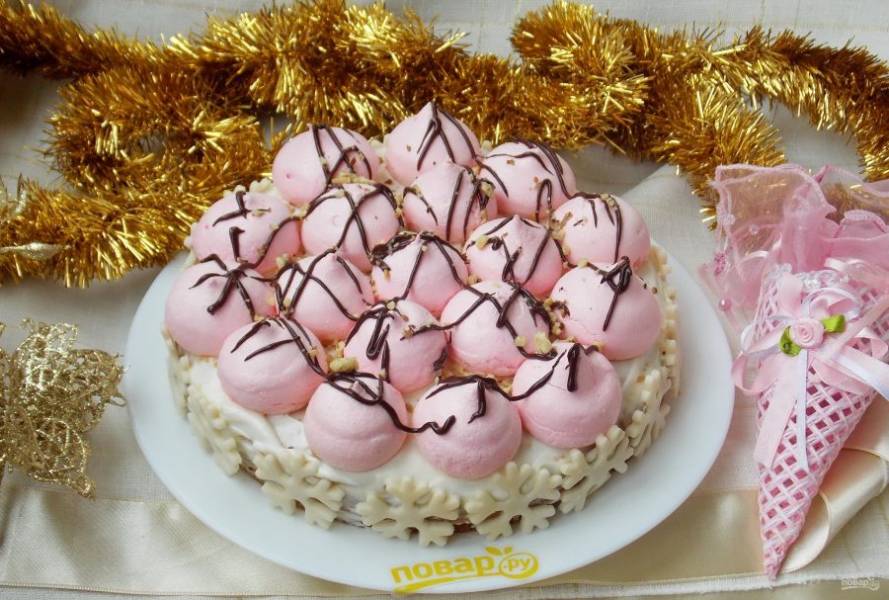 Подошла очередь украсить торт. Тут догм нет и каждый это делает по вкусу и наличию продуктов. Предлагаю свой вариант украшения торта. Из трех белков яиц, стакана сахара и пищевого красителя приготовила безе.