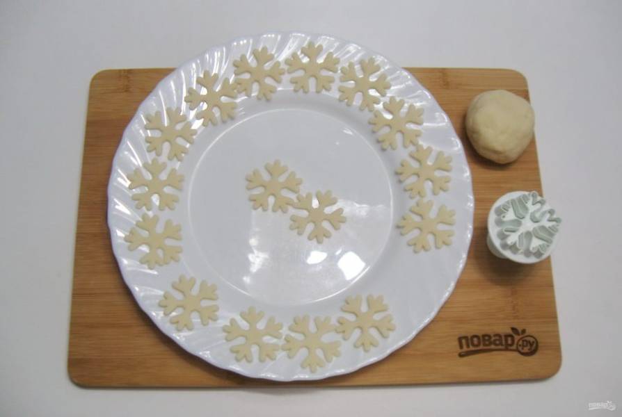 Из белой мастики с помощью плунжера (вырубки) сделала снежинки.
