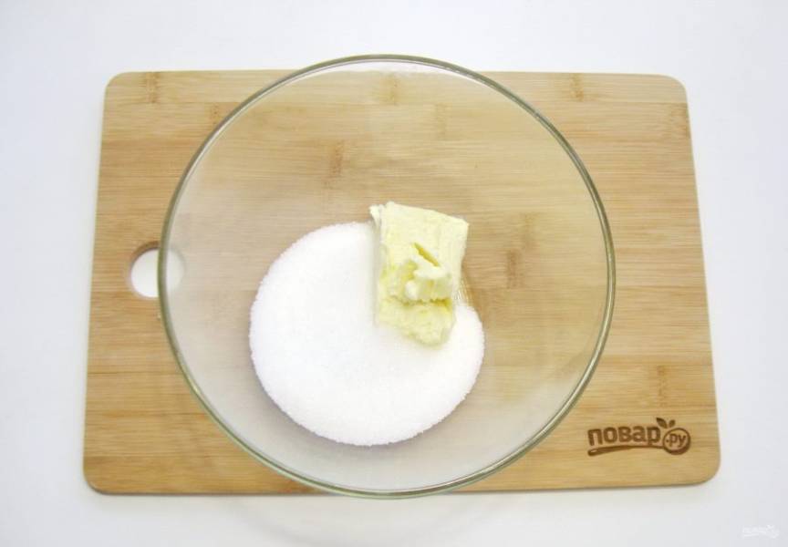 В миску выложите мягкое сливочное масло и добавьте сахар.