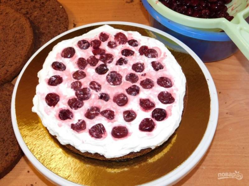 Смажьте кремом и выложите ягоды вишни.