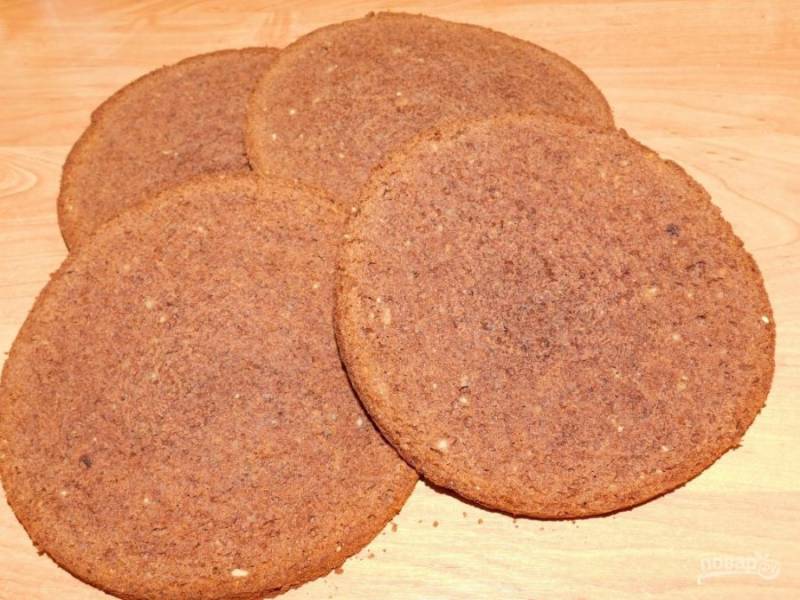 Готовый бисквит остудите и нарежьте на 3-4 коржа.