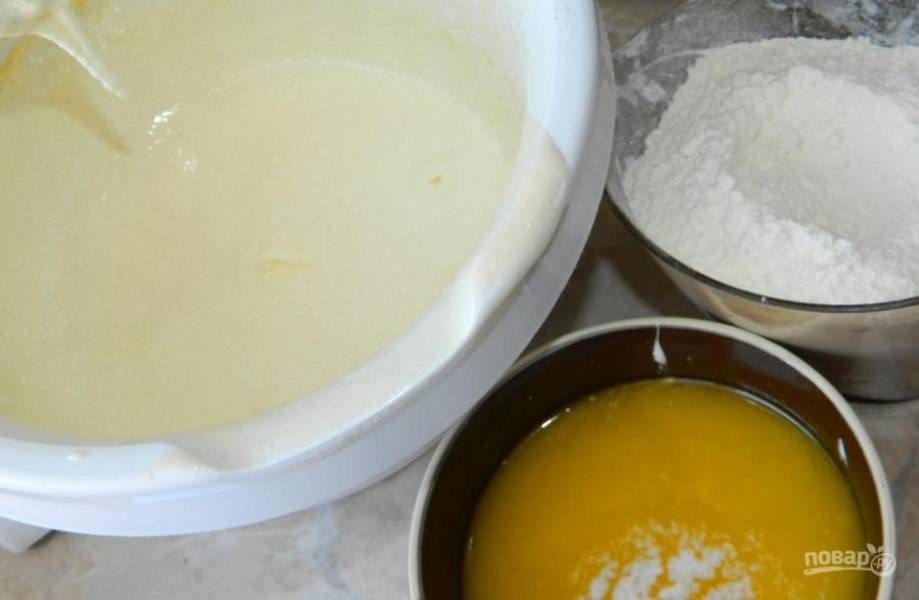 Молоко нагрейте вместе с маслом до кипения. Вмешайте в яйца вместе с мукой и содой.