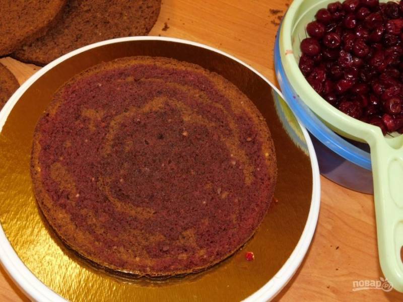 Коржи пропитайте соком от вишни.
