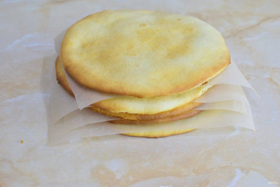 Готовые коржи перекладывайте между собой листом пергамента, чтобы они не слиплись.