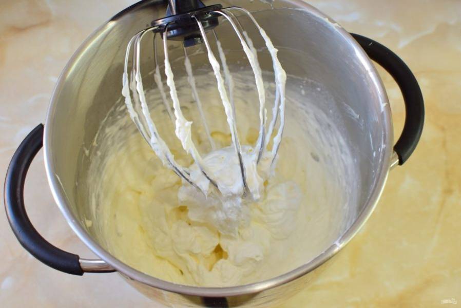 Для приготовления крема взбейте половину сливок, сыра и сахарной пудры.