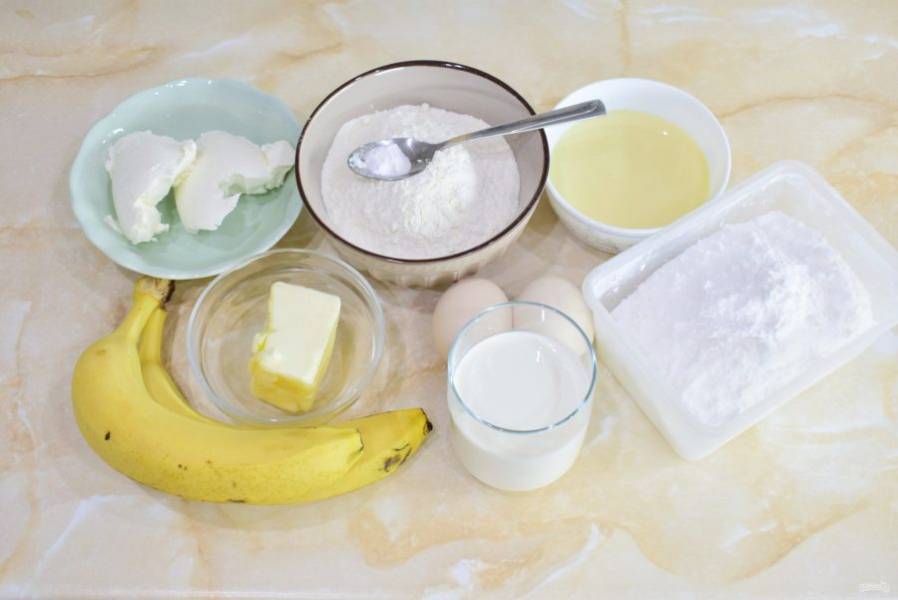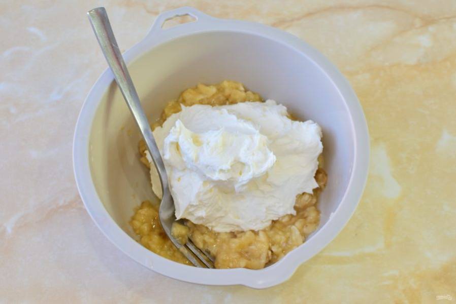 Бананы разомните вилкой. Чтобы они не темнели можно побрызгать лимонным соком. Размятые бананы смешайте с кремом.