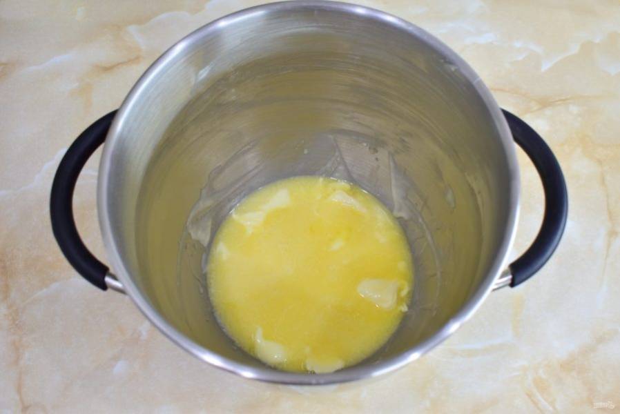 Для приготовления теста немного растопите сливочное масло, чтобы оно стало мягкое. Смешайте масло со сгущенкой.