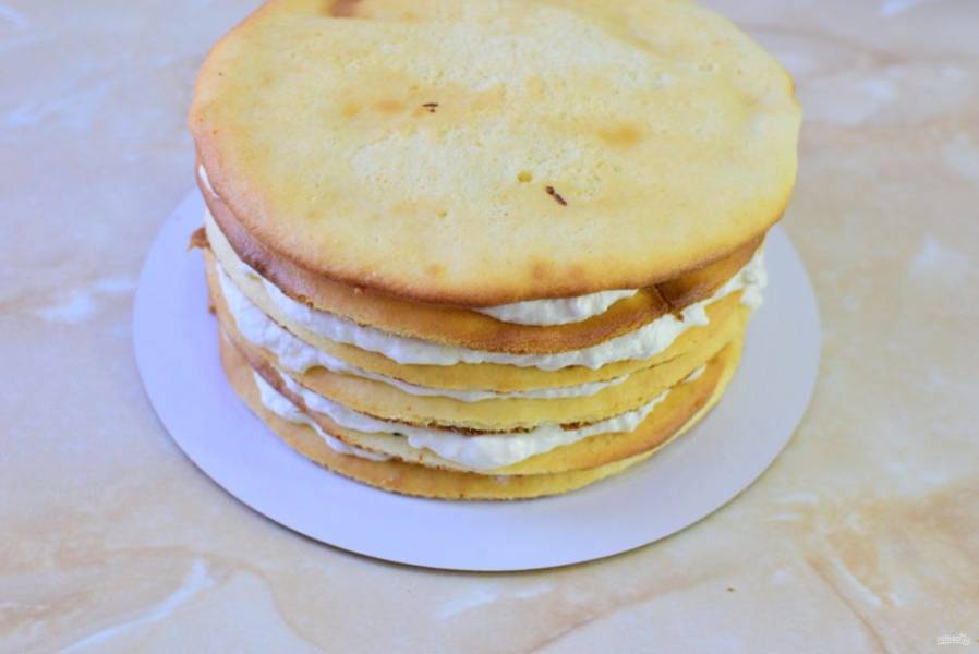 Каждый корж промажьте кремом с бананами. Пропитывать коржи не надо. Тонкие коржи пропитаются от крема.