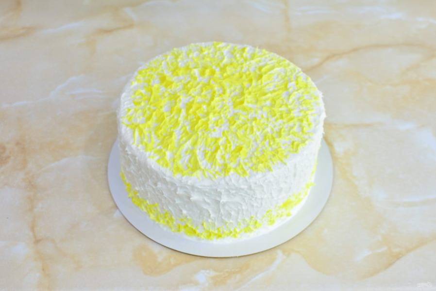 Когда вы снимите в торта кольцо и пленку, он будет ровный. Для выравнивания и внешнего оформления взбейте вторую часть крема.