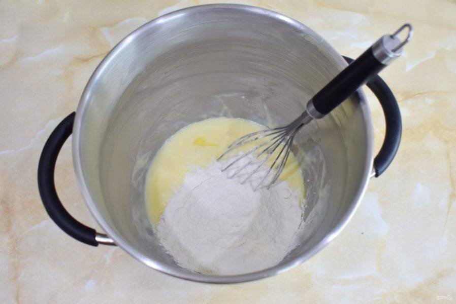 Добавьте в тесто соду и постепенно подсыпайте просеянную муку. Вмешивайте её в тесто. Муки может понадобиться чуть больше или меньше, чем указано в рецепте. Ориентируйтесь на консистенцию теста.