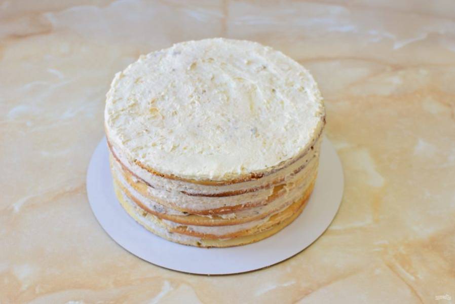 Так промажьте все коржи. Для придания формы оберните торт ацетатной пленкой и оденьте кольцо для торта. Верхние коржи прижмите и смажьте кремом. Уберите торт в холодильник на ночь. Он настоится и пропитается.