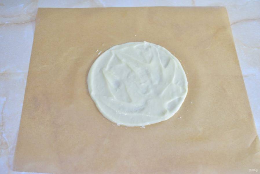 Переверните лист и тонким слоем распределяйте тесто необходимого диаметра. Выпекайте корж 2-3 минуты при 180 градусах. Коржи пекутся очень быстро!