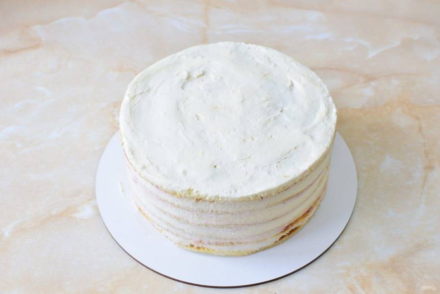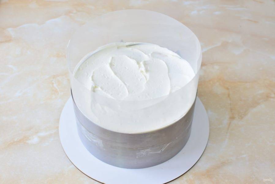 Так соберите торт. Оберните ацетатной пленкой и затяните в кольцо. Уберите на ночь в холодильник, чтобы торт пропитался.