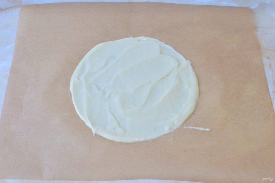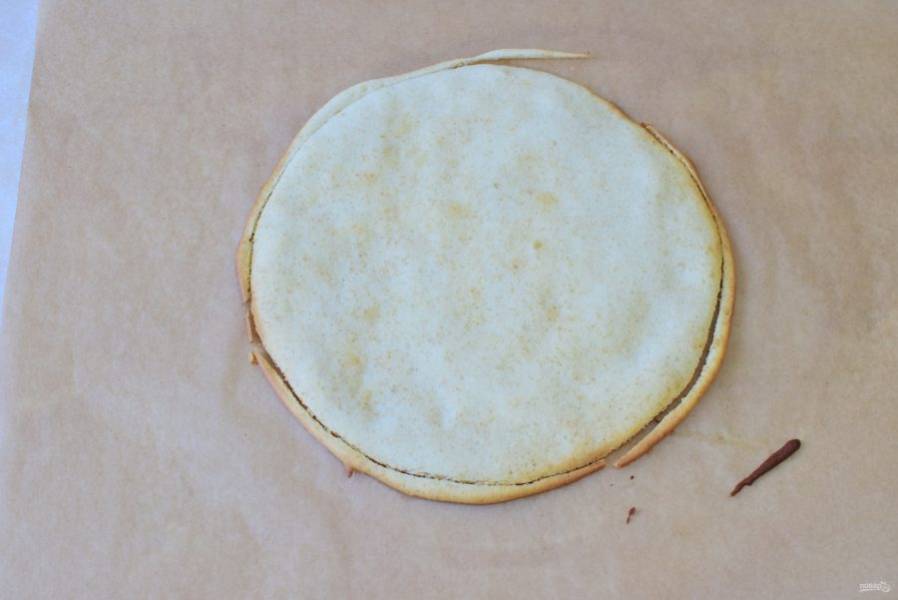 На обратной стороне пергамента начертите круг необходимого диаметра. Тонким слоем распределяйте тесто. Выпекайте корж 2-3 минуты при 180 градусах. Ориентируйтесь по своей духовке.