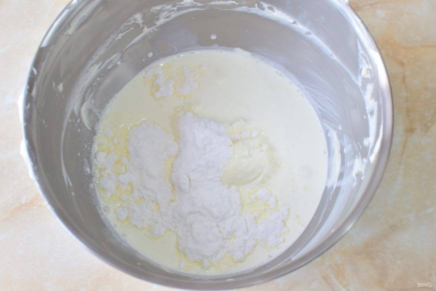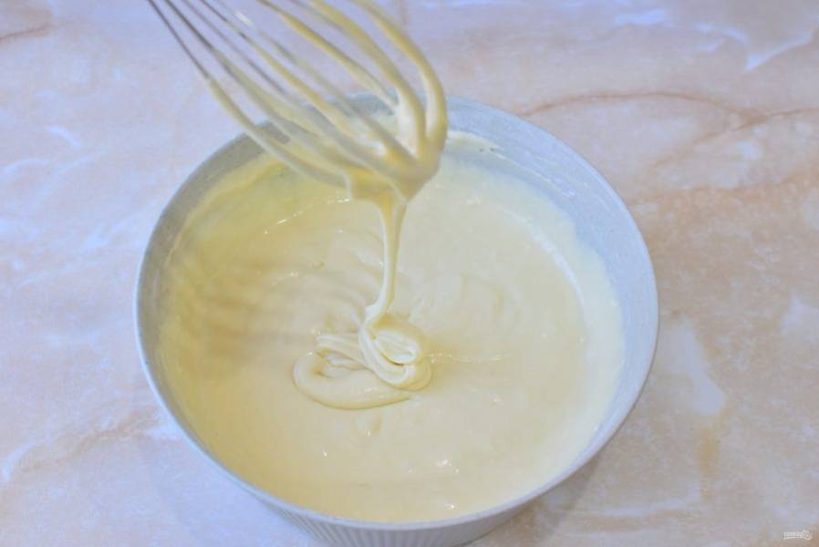 Добавьте соду. Подсыпайте муку и замешивайте тесто, чтобы оно получилось густой, немного текучей консистенции.