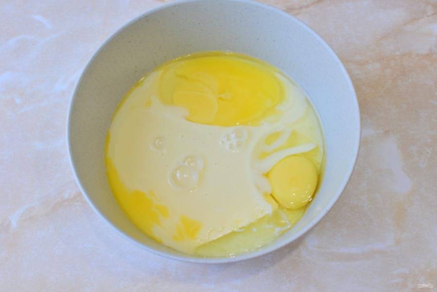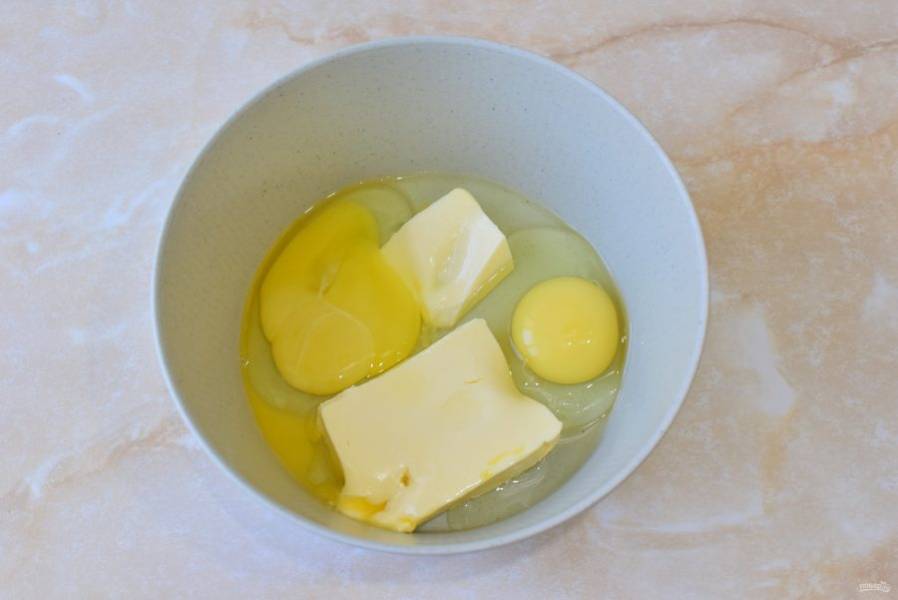 Для теста соедините яйца с мягким сливочным маслом.