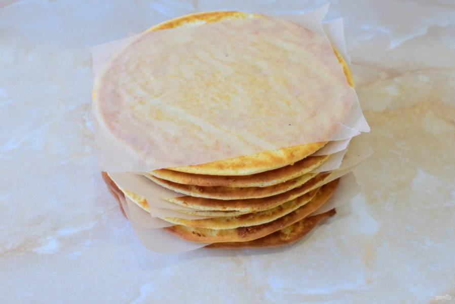 Готовые остывшие коржи проложите листом пергамента, чтобы они не слипались.