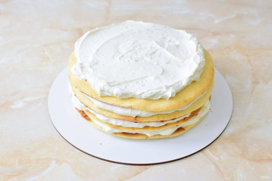 Промазывайте коржи кремом и собирайте торт. Тонкие молочные коржи дополнительно пропитывать не надо.