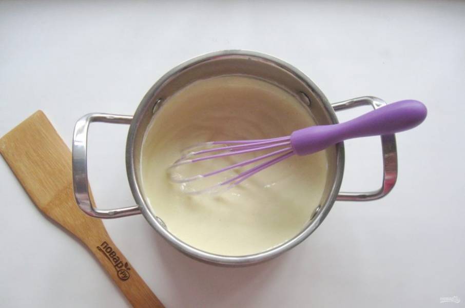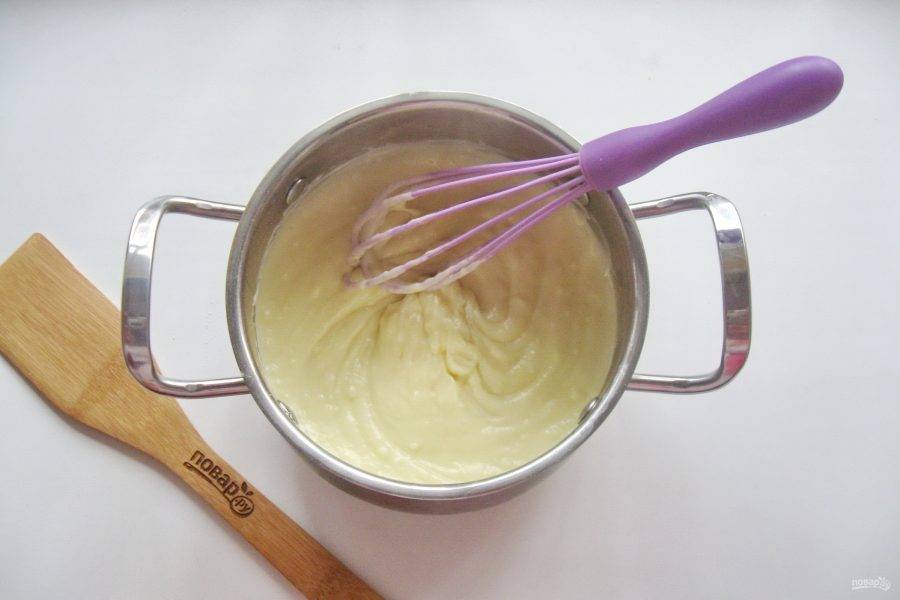 Поставьте кастрюлю на плиту, перемешивая доведите смесь до загустения. На это уйдет 7-8 минут. Огонь чуть ниже среднего, чтобы крем не пригорел. Можно заваривать крем на водяной бане. Готовый крем охладите.