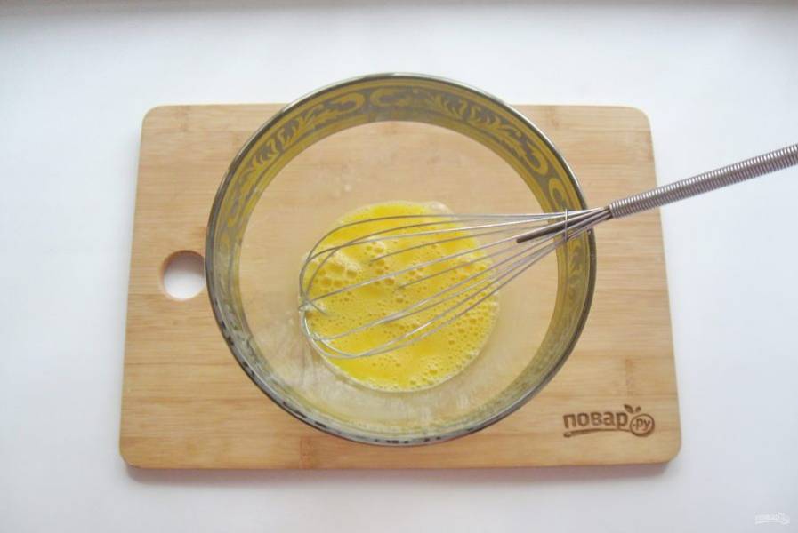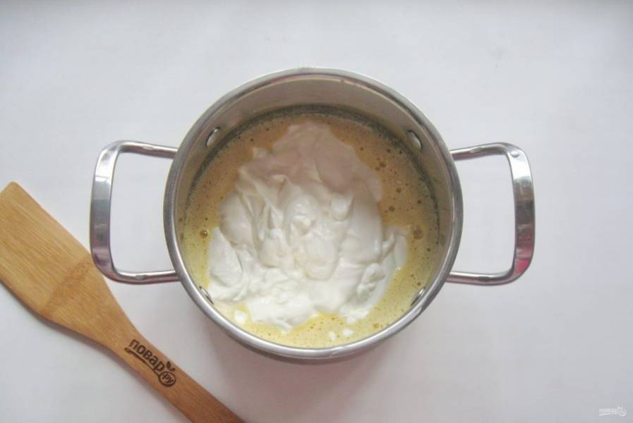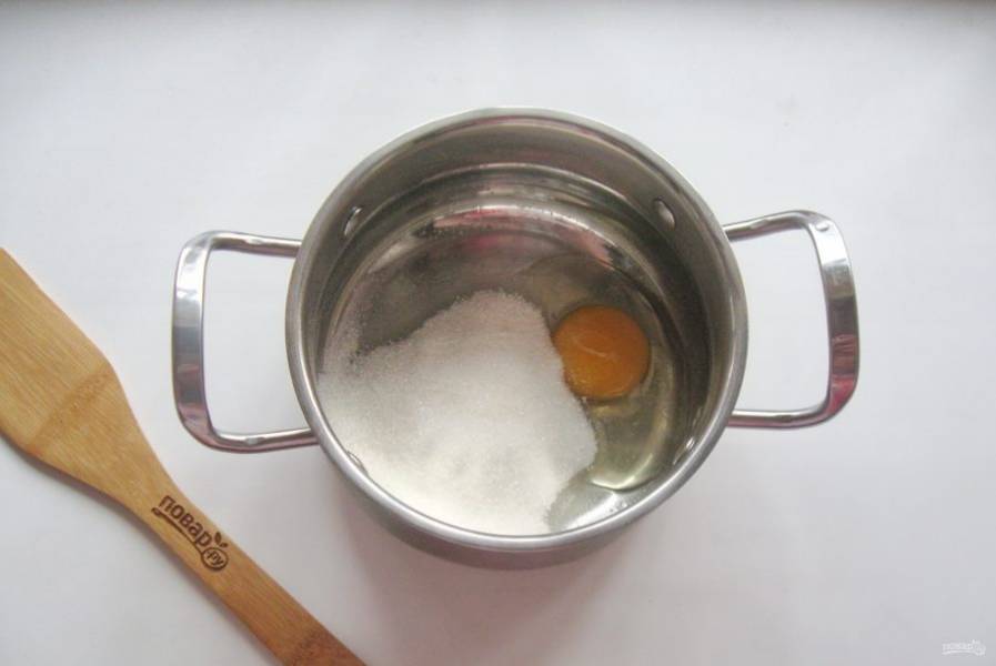 Приготовьте крем "Пломбир" для торта. В кастрюлю с толстым дном разбейте яйцо, добавьте сахар и ванильный сахар.