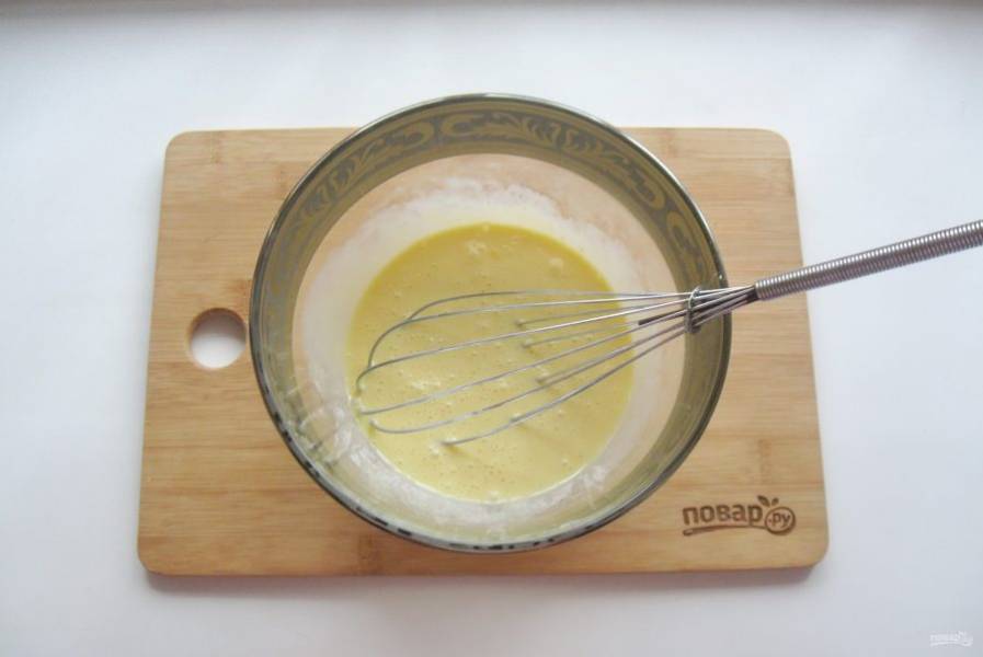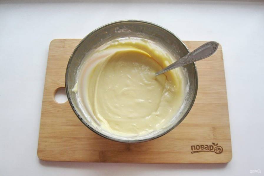 Венчиком перемешайте сметану, сахар, ванильный сахар и муку. Комочков не должно быть.