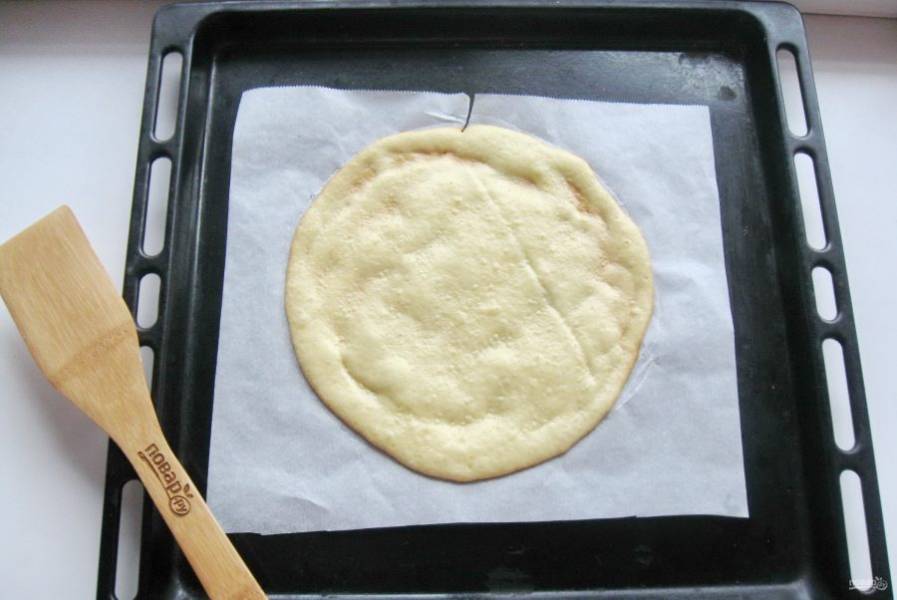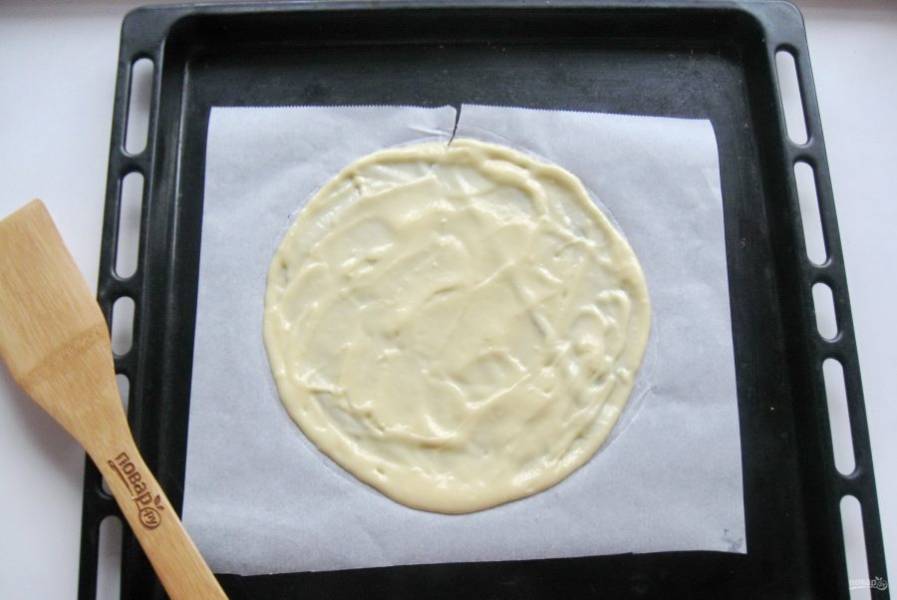 На пергаменте нарисуйте круг диаметром 18-20 сантиметров и выложите на него 2 столовые ложки теста. Распределите тесто по бумаге.