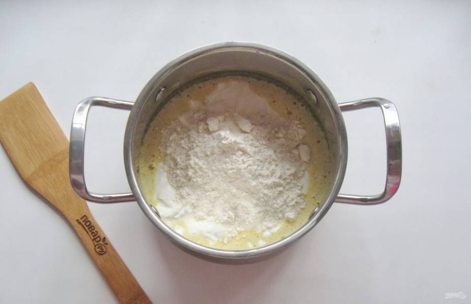 Всыпьте 3 столовые ложки муки с хорошей горкой.