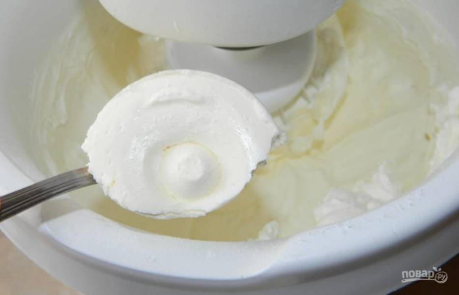 Для крема взбейте сливки с сахарной пудрой. Добавьте творожный сыр.