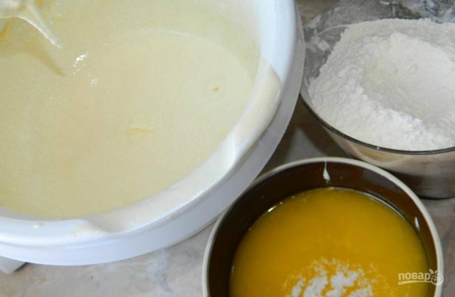 Отдельно доведите до кипения молоко и сливочное масло. Аккуратно вмешивайте в пышную яичную массу муку с содой и молочно-масляную смесь.