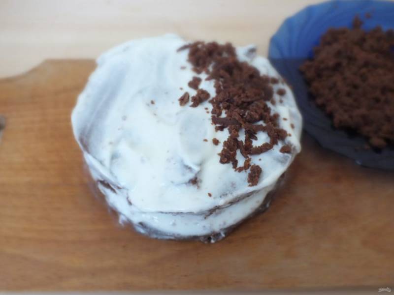 Соберите торт. Каждый корж промажьте сметанным кремом. Верх и бока осыпьте крошкой.