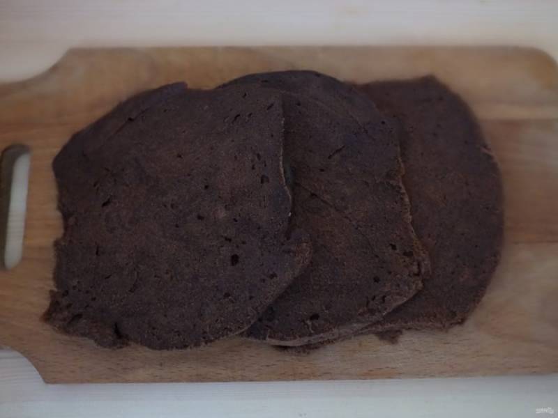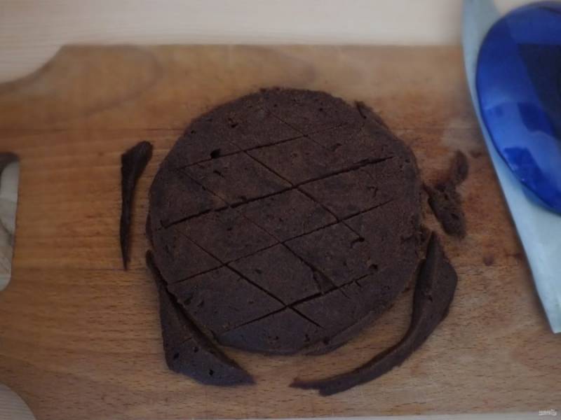 Каждую часть обрежьте, придав круглую форму. По всему коржу сделайте надрезы. Обрезки измельчите в крошку.