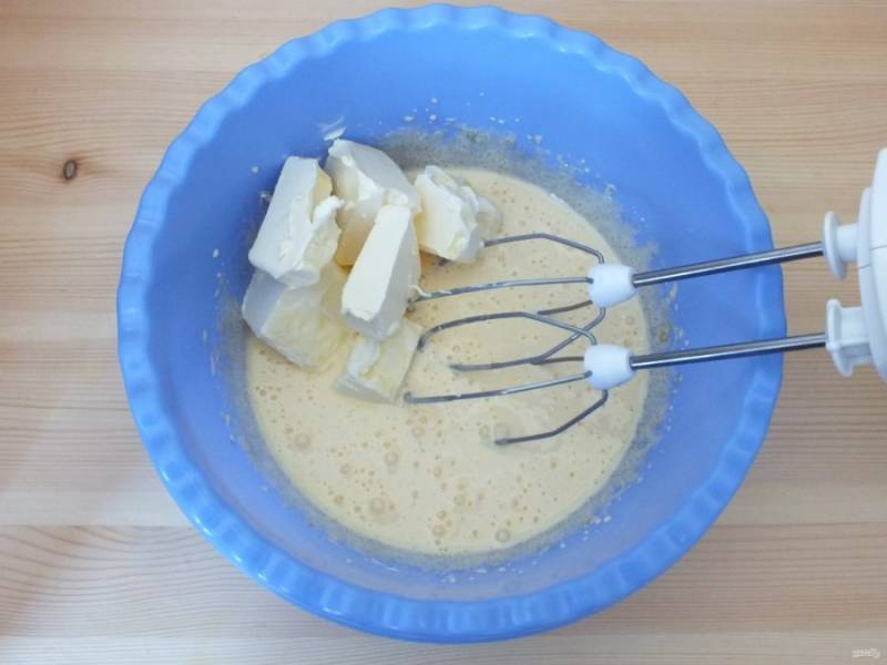 Желтки взбейте с сахаром и солью. Добавьте мягкое масло. Еще раз взбейте.